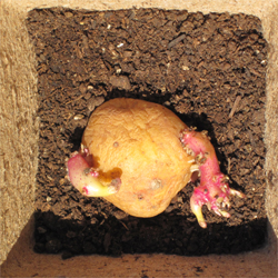 | Use Jiffy 3" pots and fill them half way with rich compost. If you can recognize an eye place the eye or sprout pointing up. Expose to moderate light. Growing lights can run 12 hours as the neon lights don't develop enough power compared to sun light.